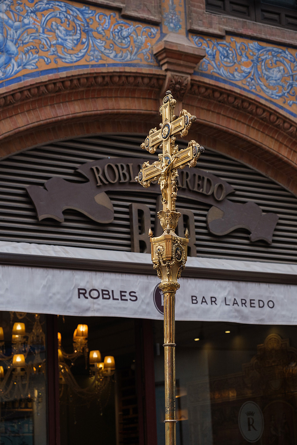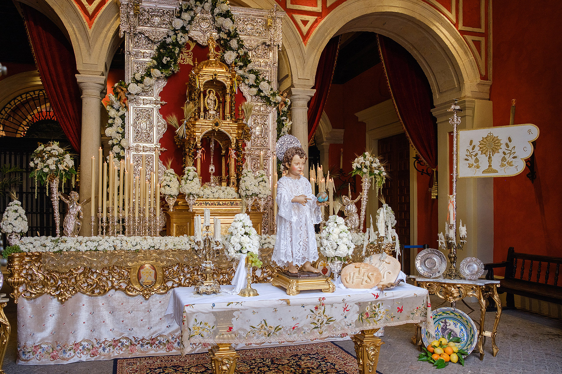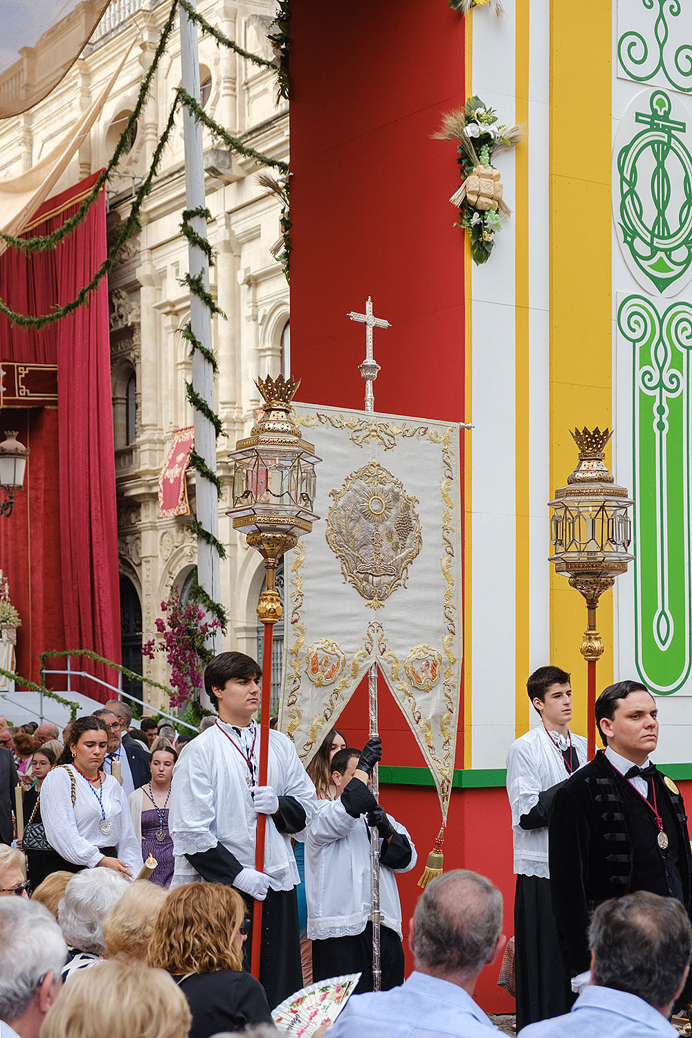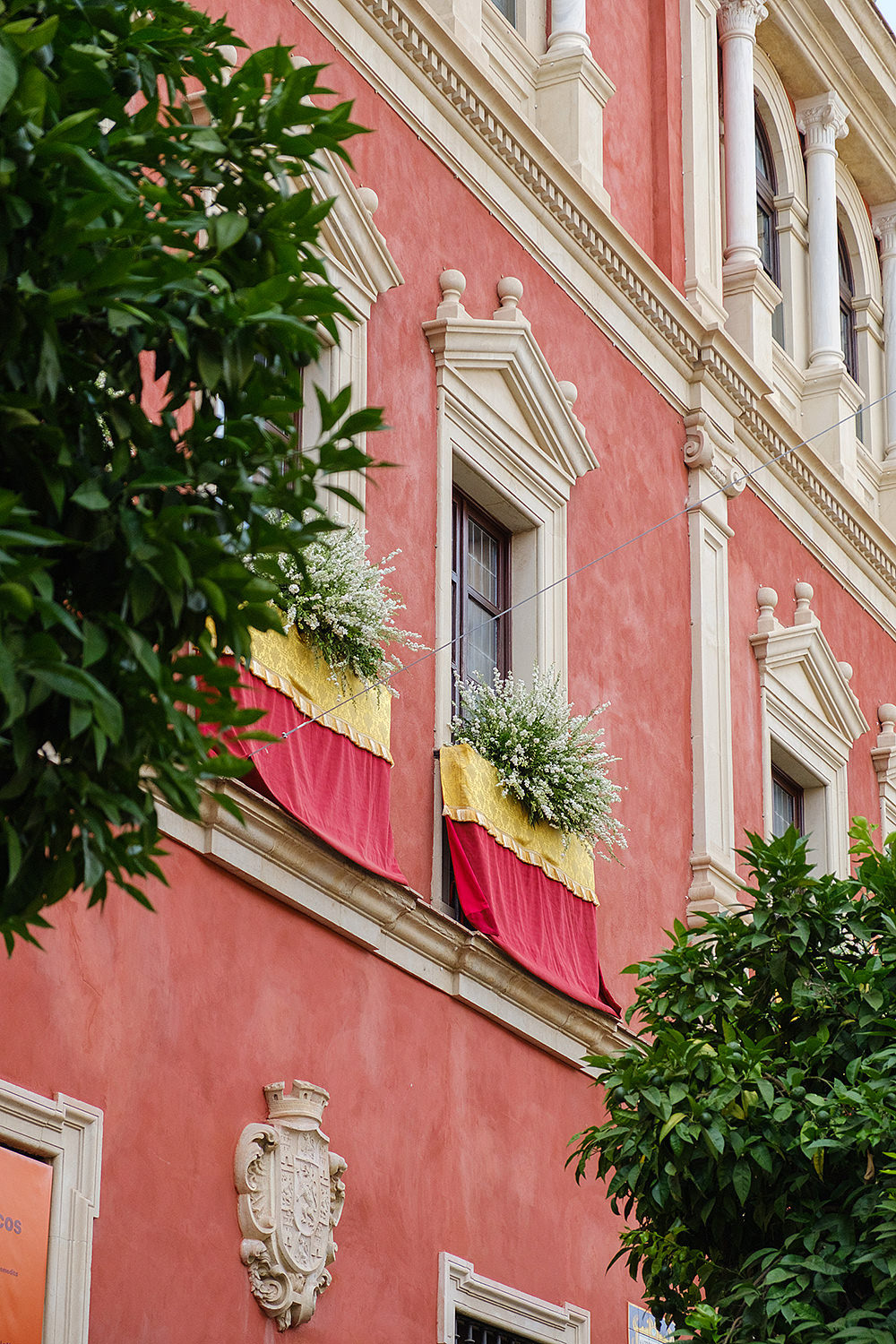 Although not as big as the Easter procession, the Corpus Christi one in Seville is still a major event. The fresh rosemary aroma fills the air and mixes with the chatter of the spectators as different brotherhoods glide through the streets with their banners and saints. The city is decorated to celebrate in red velvet and gold. Beautifully crafted street altars adorn passages, shop windows and corners. Everyone is dressed in full formal attire despite the 40+ degree heat and the procession participants do not seem to be breaking even a drop of sweat. I am convinced they are a different species which does not feel the heat the same way normal humans do. My eyes kept wandering to the nearby residents who chose to watch the procession from their terraces. The quick access to water and air conditioning must have been really handy. As impressive as the full procession and the city decoration was, the post procession vibe of the whole community coming together in tiny corners, bars and cafés to chat and mingle, was my favourite part. After all, who can resist the idea of a beer, a fruity wine or the tastiest fresh orange juice in June?