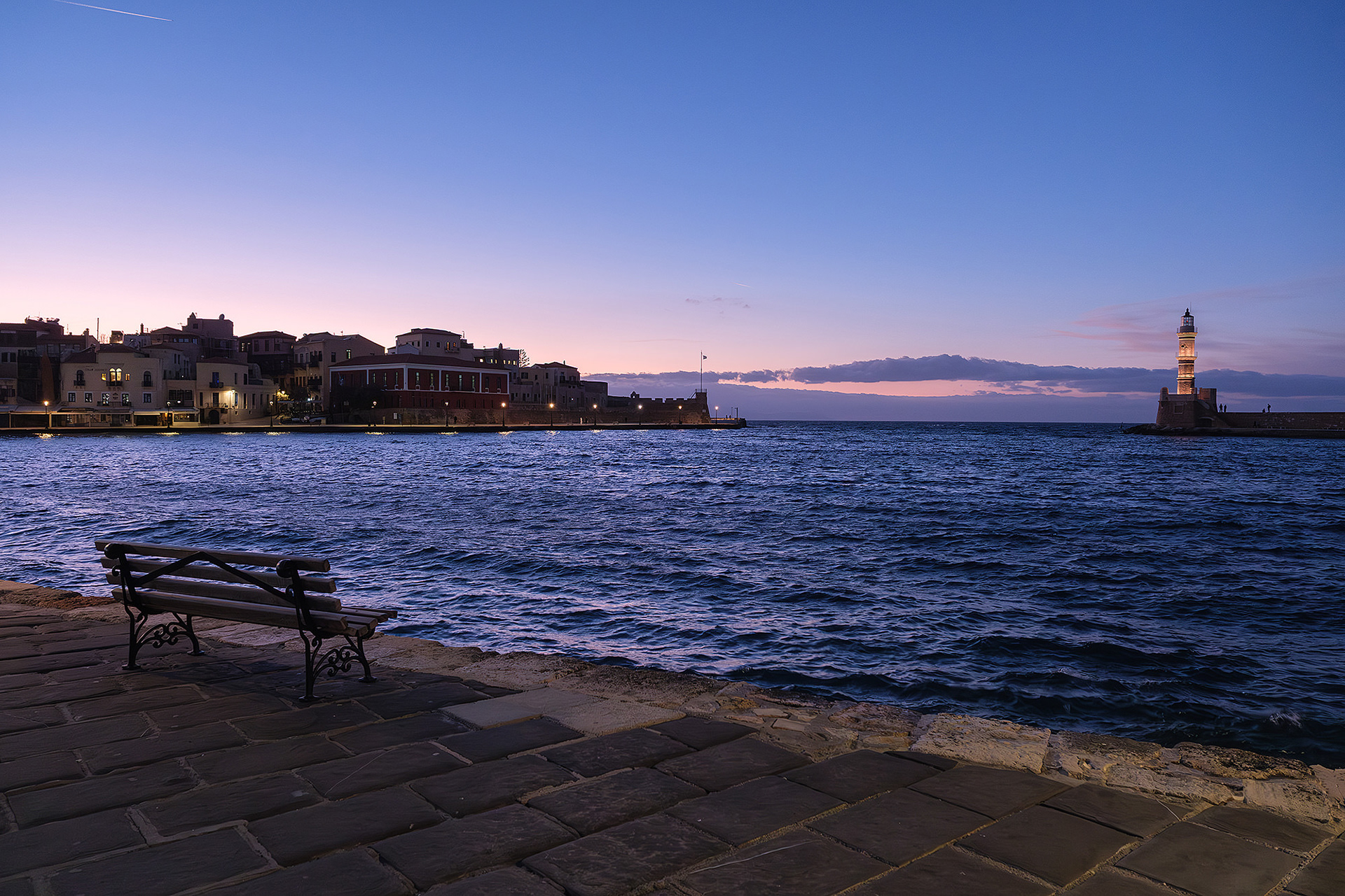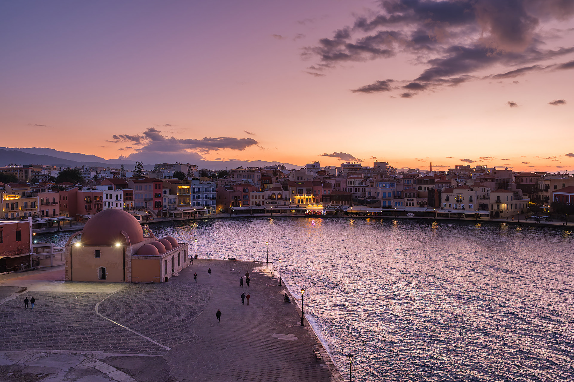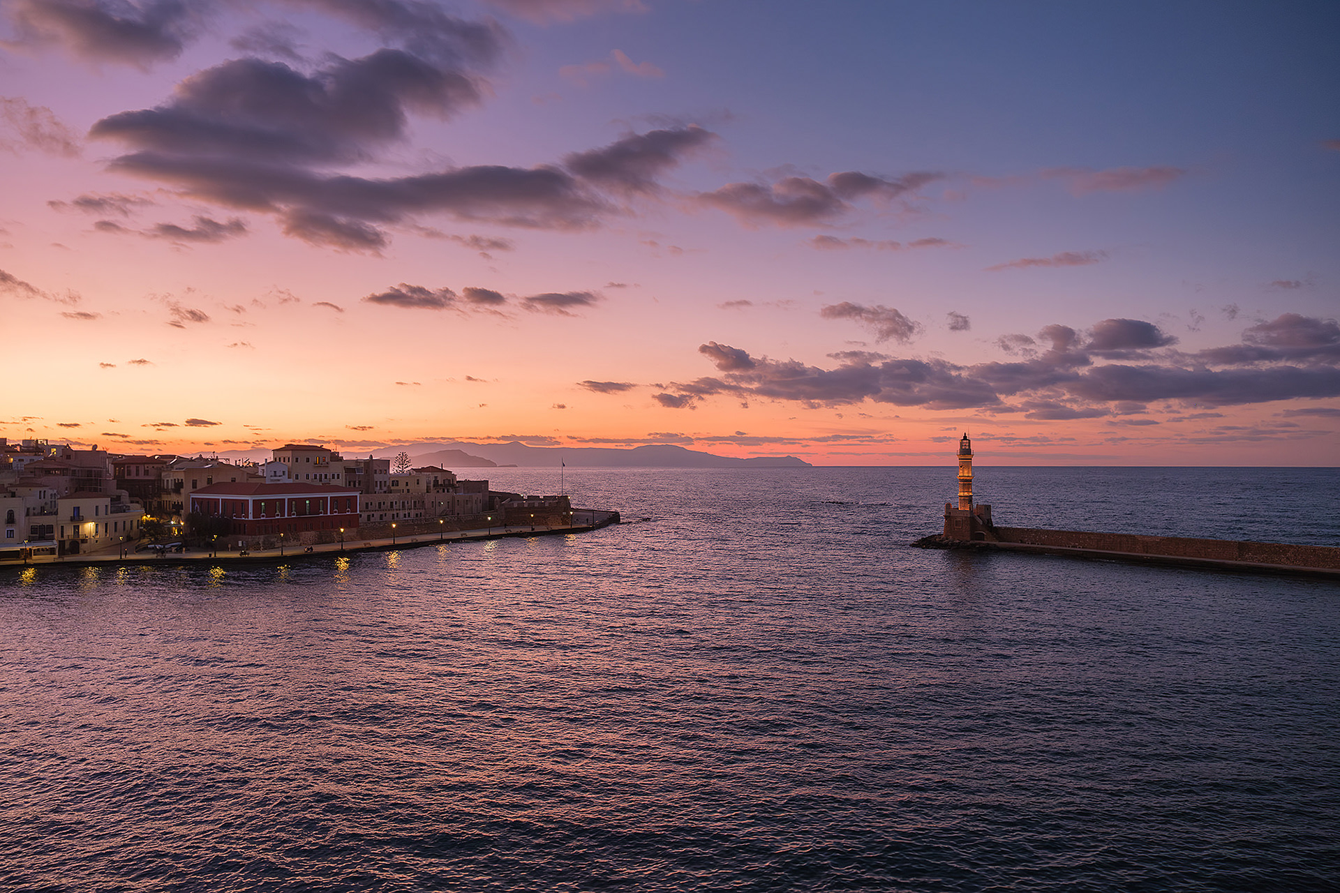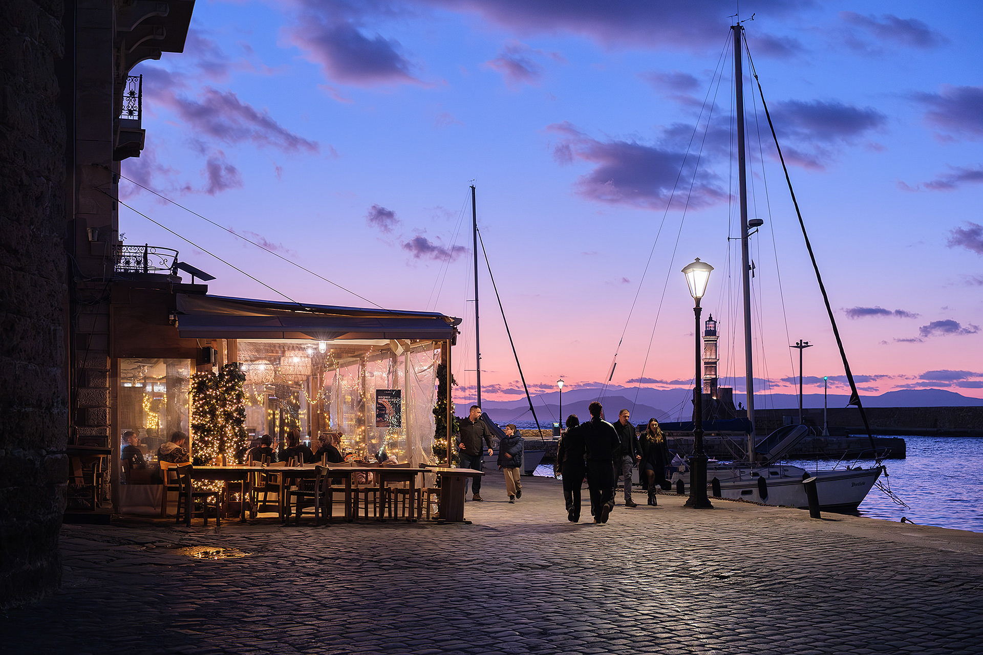 Out of season Chania is quiet... or so it seems until evening comes. As dusk falls upon the Old Venetian Port, the empty streets fill up with locals and occasional tourists ready to brave the notorious winter winds for a stroll to the lighthouse, a meal or a drink. Firelit clouds glide through the sky nonchalantly, unperturbed by the budding night life underneath. The street lights come to life with a seductive glimmer. Sweet laughter mixes with the sounds of the waves and tempts you to cosy up in a bar or just walk infinitely. All you need is a steady scarf and a wind-proof jacket.
