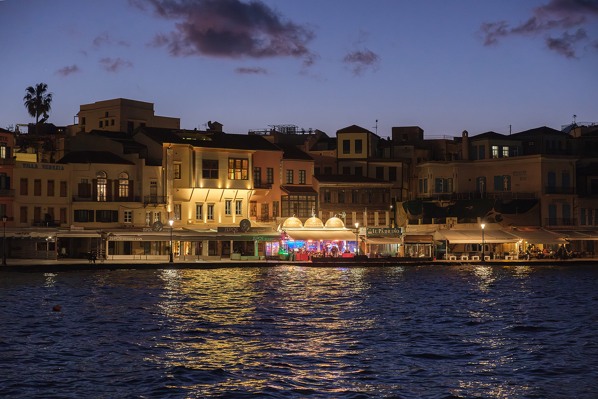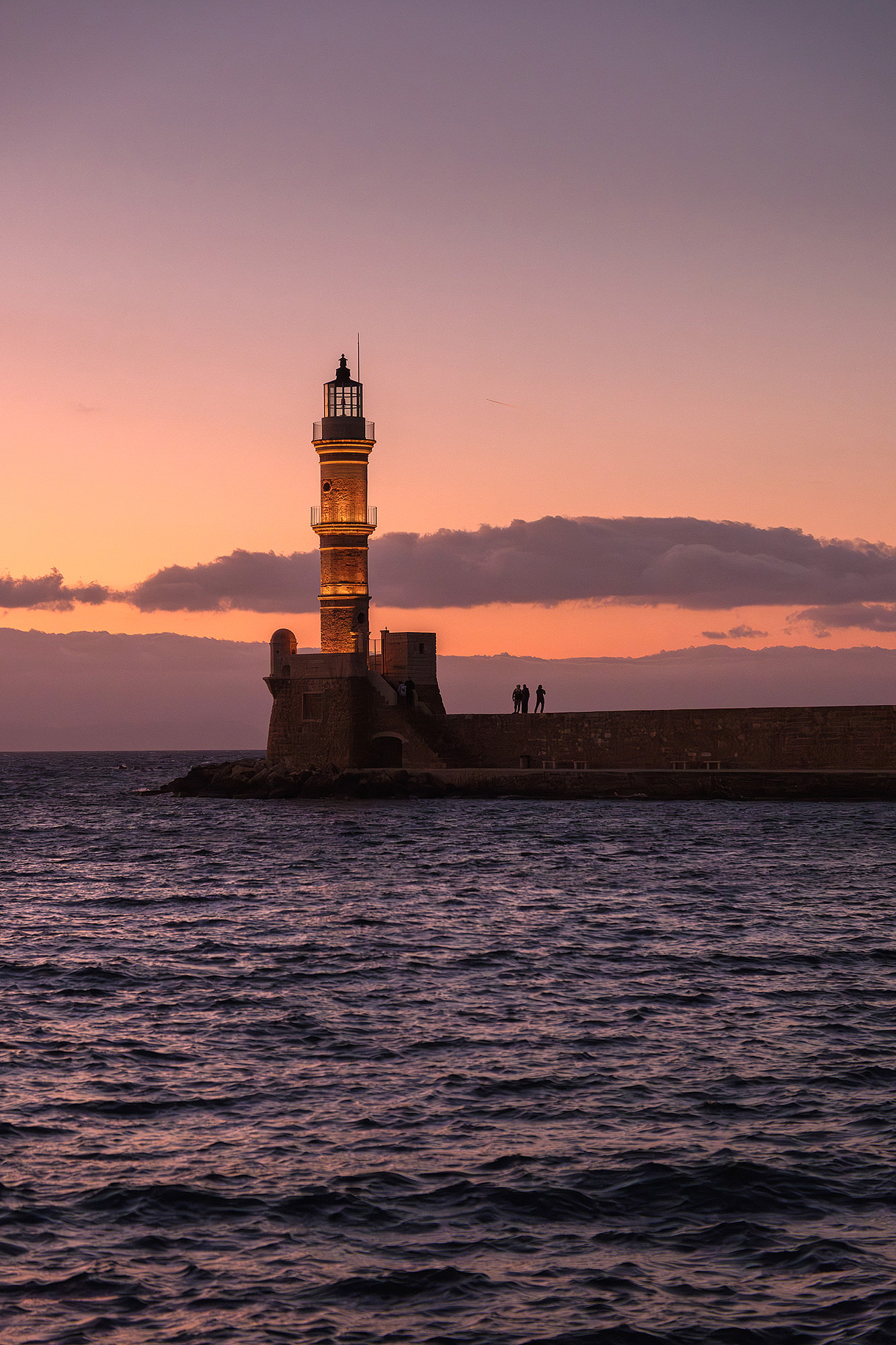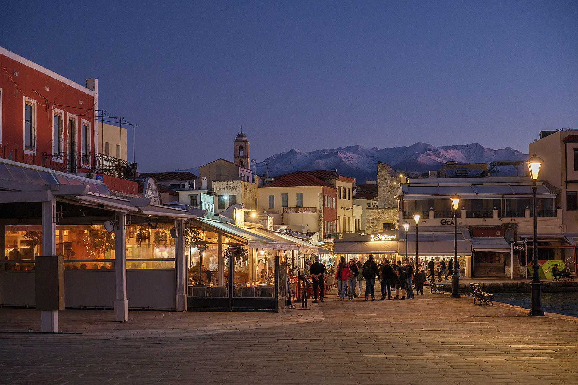 Out of season Chania is quiet... or so it seems until evening comes. As dusk falls upon the Old Venetian Port, the empty streets fill up with locals and occasional tourists ready to brave the notorious winter winds for a stroll to the lighthouse, a meal or a drink. Firelit clouds glide through the sky nonchalantly, unperturbed by the budding night life underneath. The street lights come to life with a seductive glimmer. Sweet laughter mixes with the sounds of the waves and tempts you to cosy up in a bar or just walk infinitely. All you need is a steady scarf and a wind-proof jacket.