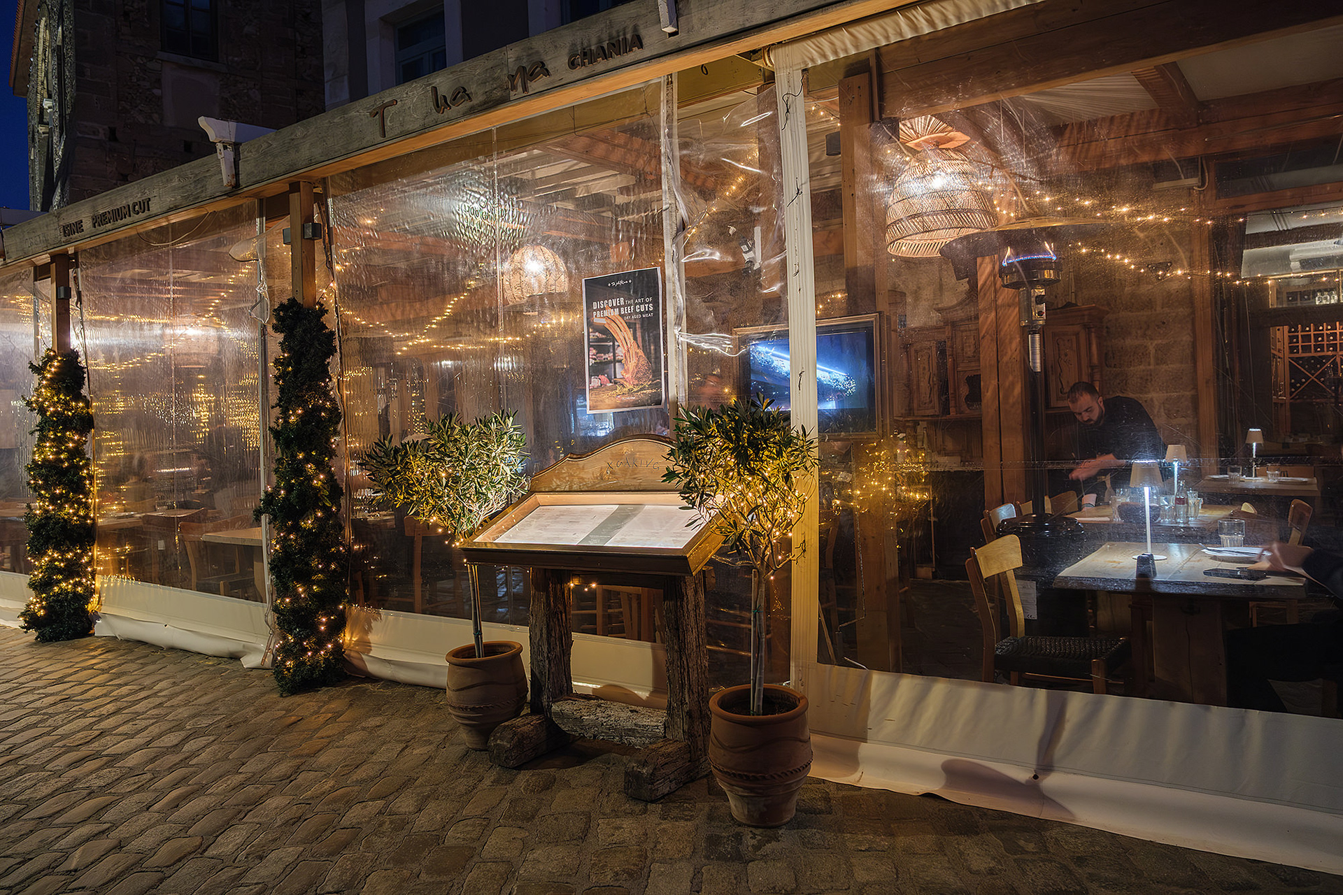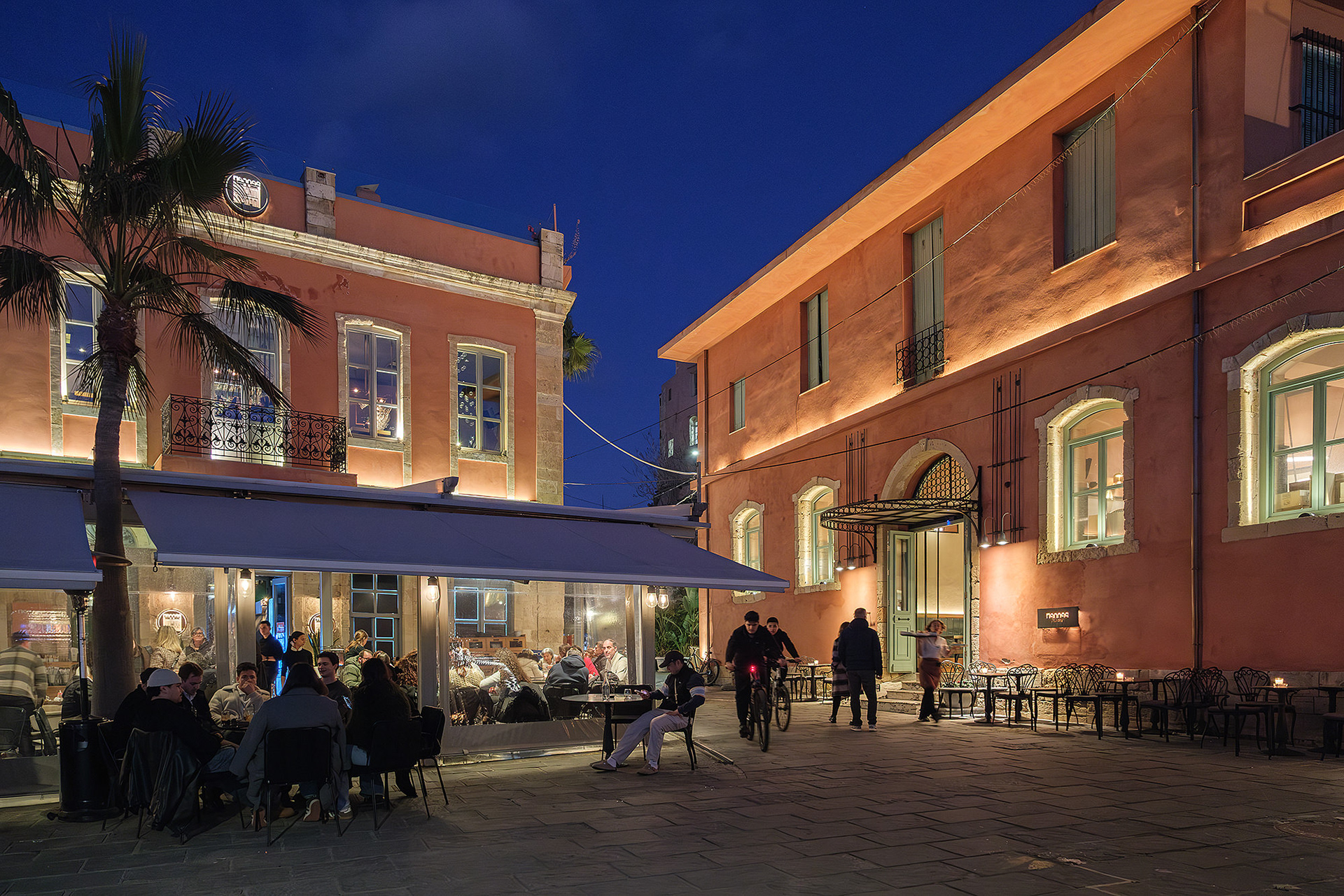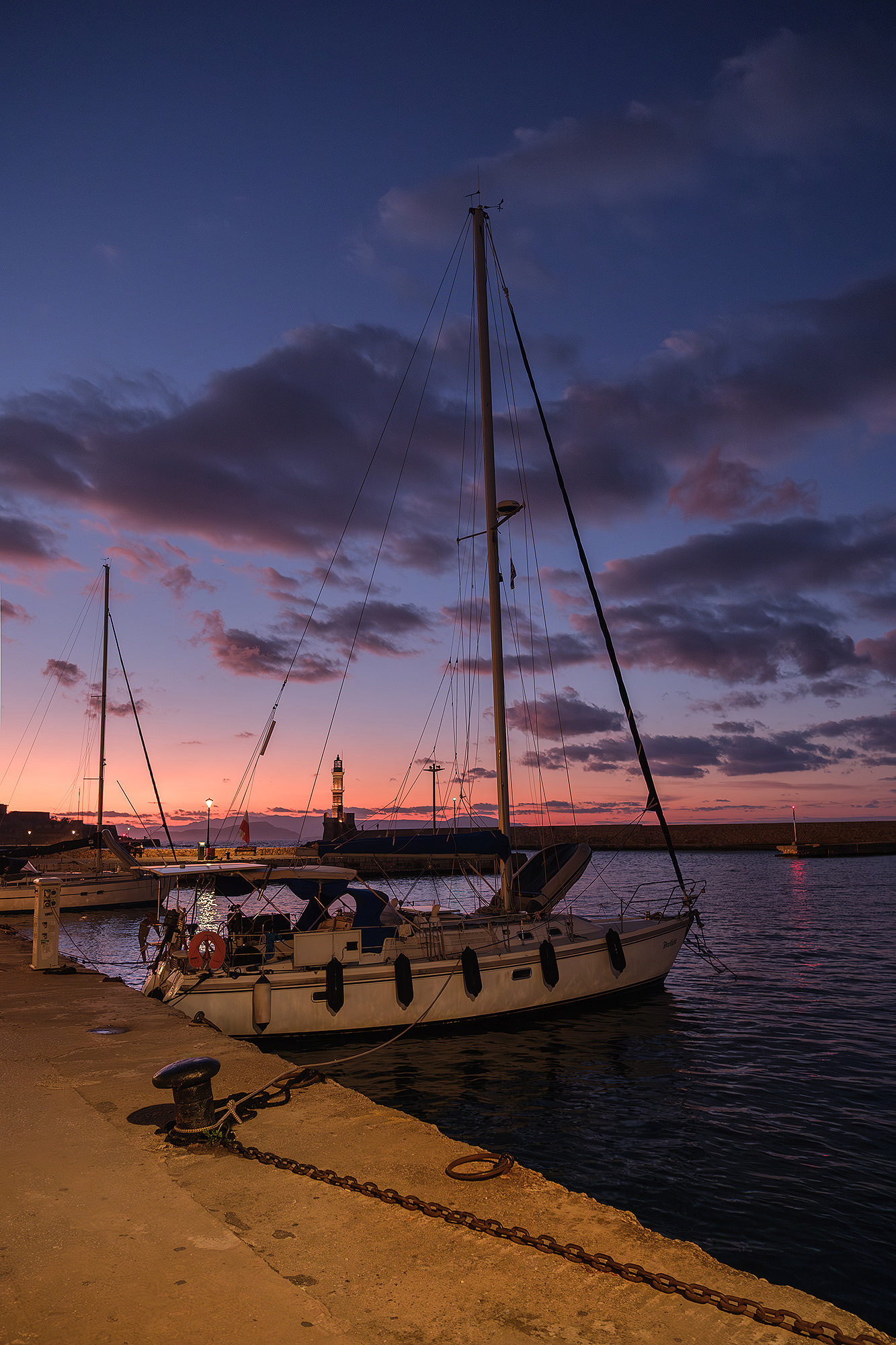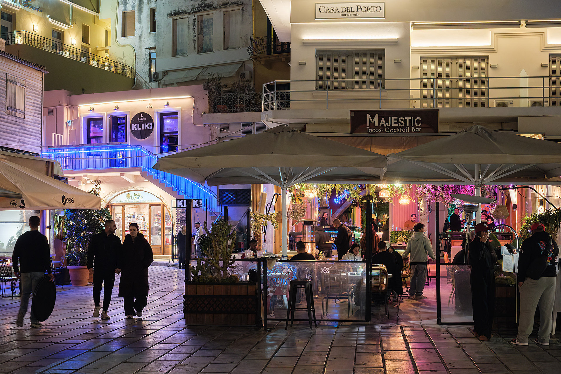 Out of season Chania is quiet... or so it seems until evening comes. As dusk falls upon the Old Venetian Port, the empty streets fill up with locals and occasional tourists ready to brave the notorious winter winds for a stroll to the lighthouse, a meal or a drink. Firelit clouds glide through the sky nonchalantly, unperturbed by the budding night life underneath. The street lights come to life with a seductive glimmer. Sweet laughter mixes with the sounds of the waves and tempts you to cosy up in a bar or just walk infinitely. All you need is a steady scarf and a wind-proof jacket.